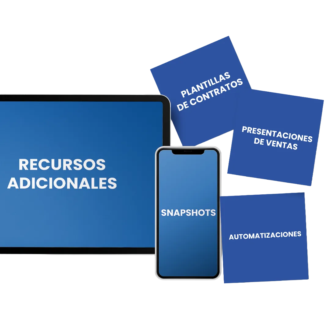Cientos de plantillas, presentaciones, guiones, contratos y todos los recursos que necesitas para obtener resultados desde el primer día.